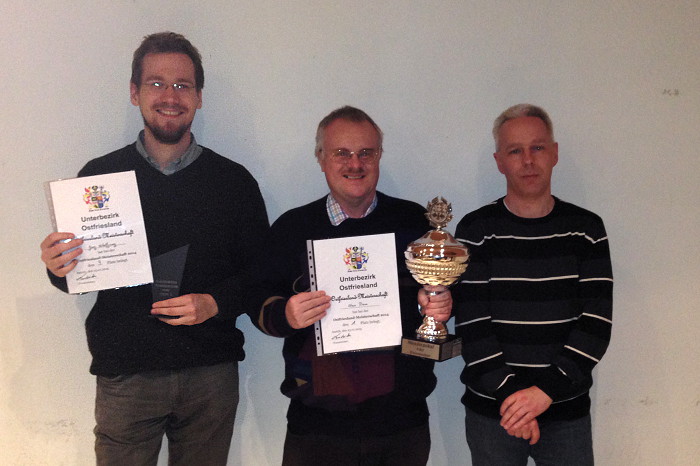 Photo: Georg Wolffgang (3. Platz), Uwe Rau (1. Platz) und Nils Friedrichs (Vorsitzender des Schachbezirkes Ostfriesland).